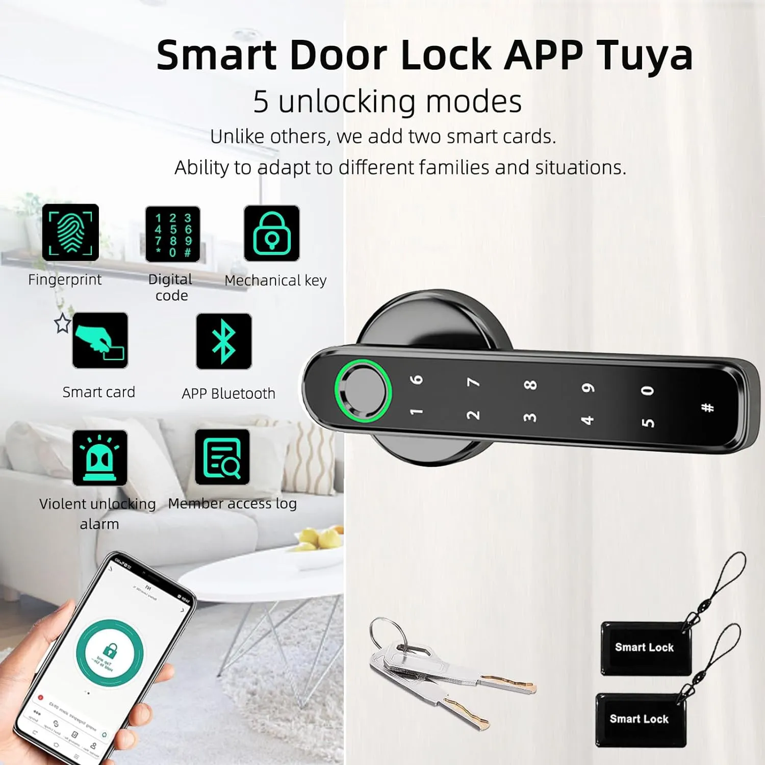 Smart Door Lock – Keyless Entry with Wireless, Password, Fingerprint, Tuya App Control, Compatible with Google Home or Alexa, Black Aluminum Alloy, Wireless & Voice Activated